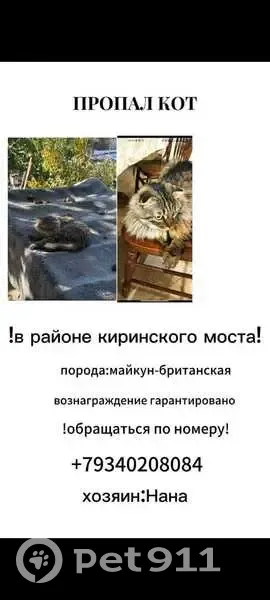 Сбежал из дома и потерялся кот. Кот домашний, кастрированный, большой, помесь Мейн куна и британской породы. Пушистый, уши короткие. Огромная просьба вернуть за вознаграждение!