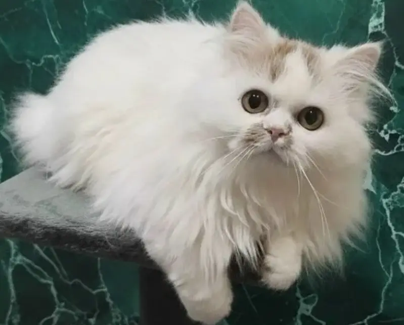 Длинношерстная, белая с черным хвостом, на левом боку и на голове пятнышки.
