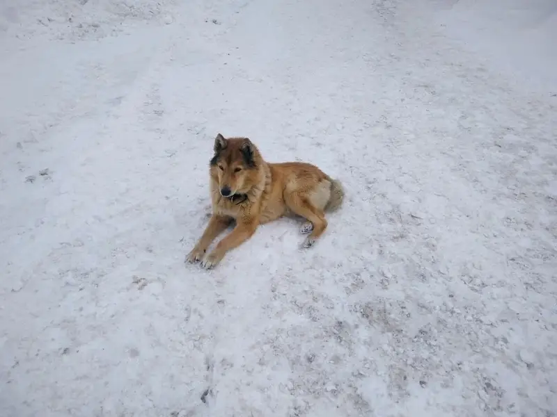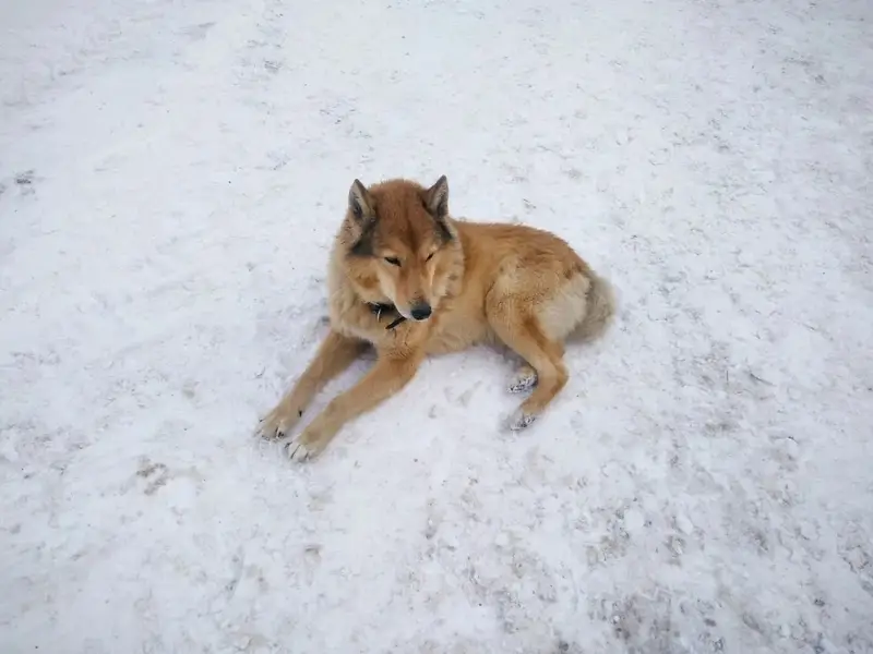 Рыжо коричневый, хвост рогаликом, похож на лису, порода сиба-ину