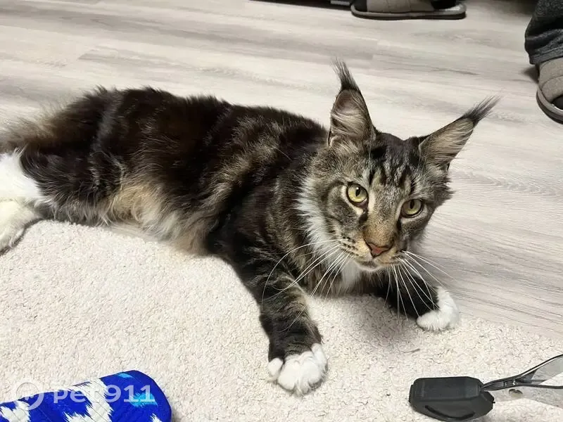 Внешне похож на мейн-куна, может быть помесь, вроде бы кастрированный кот.... Домашний, ласковый, постоянно ласится. По ночам плакал под сараем, позвали домой... Зашел... Ведёт себя как дома.
