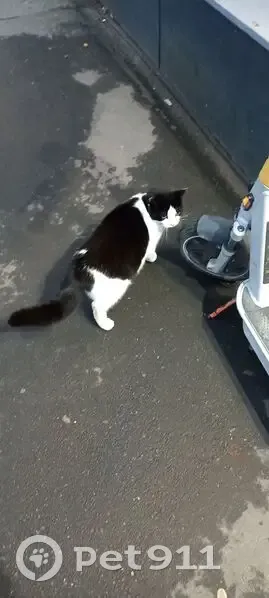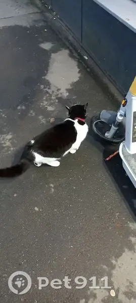 Кошка замечена на улице возле входа в магазин магнит. На вид ухоженная, чистая. На шее пластиковый розово-красный ошейник. Если позвать, то подходит, нюхает, отходит.