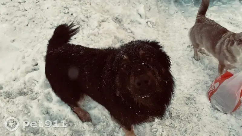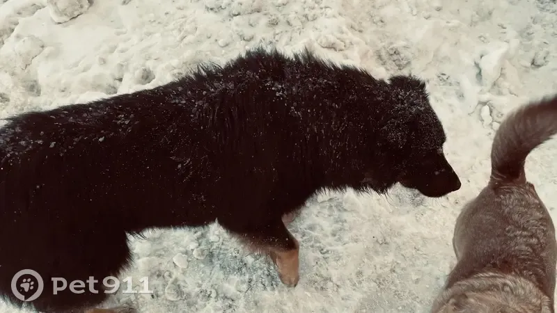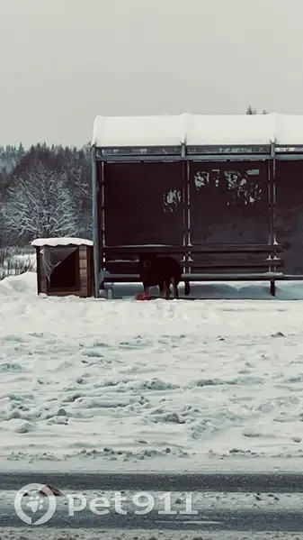 Собака черная с коричневыми лапами и мордой. Собака очень большая лохматая и очень добрая. К людям подходит и доверяет. Появилась в сентябре и до сих пор её никто не забрал. На остановке ей поставили будку, но здесь достаточно оживленная трасса.