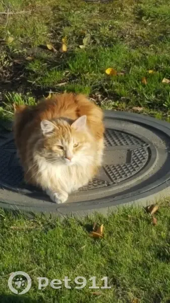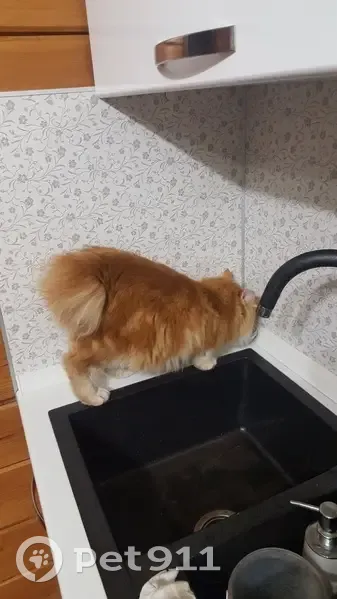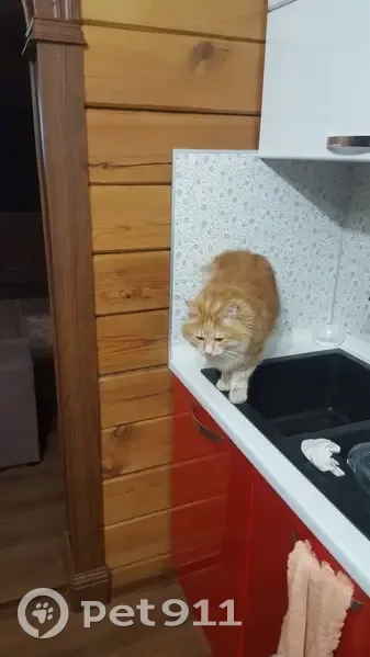 Курильский бобтейл, без хвоста, рыжий, длинношёрстный, кастрирован, возраст 5 лет, крупный, весит около 5 кг. Ласковый, хороший охотник. Уходил всегда в ночную охоту за мышами и возвращался домой. Впервые не вернулся.
