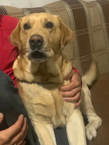 Палевый окрас. На шее цепочка. На щеке зеленка. Морда покоцана.
