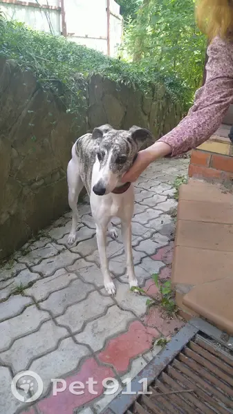 Порода уиппет (английская борзая). Кобель, кличка Перс, возраст 3 года. Окрас халвичный, белый с серо-бежевыми пятнами, серый. Был в черном кожаном ошейнике. Просьба сообщить по телефону +79621327566
