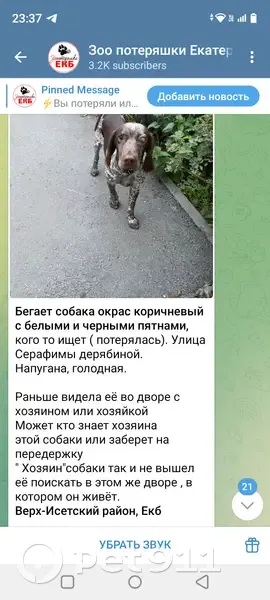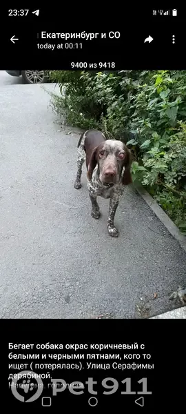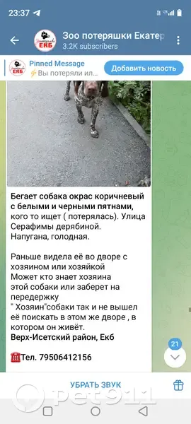 Замечена охотничья собака. По улице Серафимы Дерябиной. Телефон указан на фото.