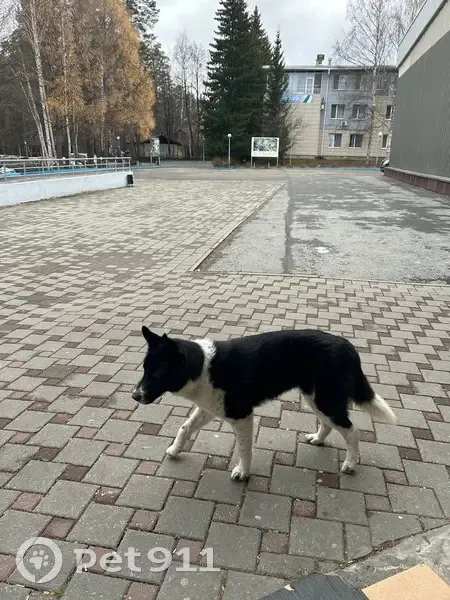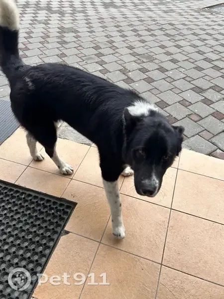 Крупный кобель, черно-белого окраса, молодой, есть след от ошейника