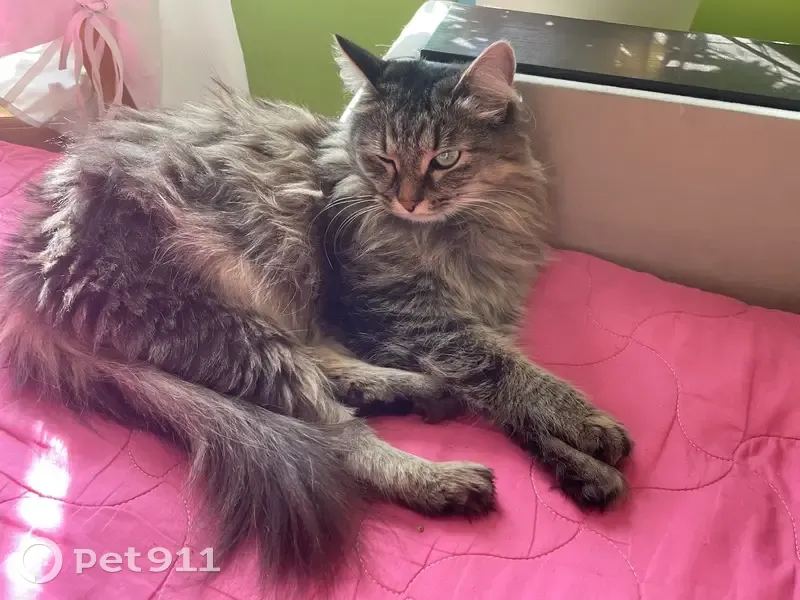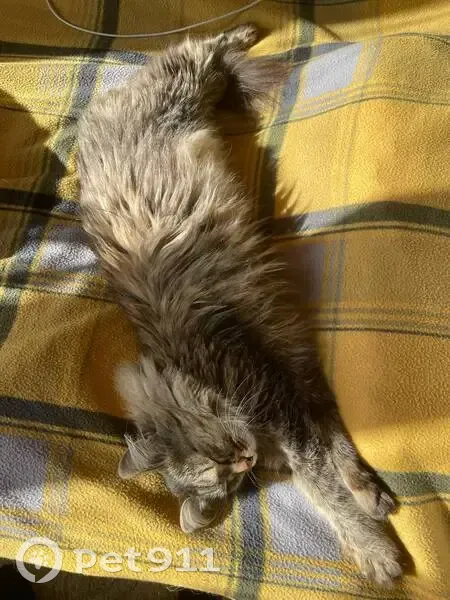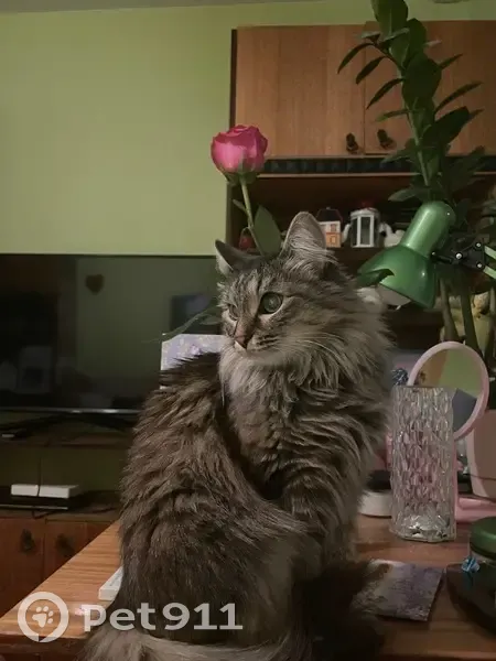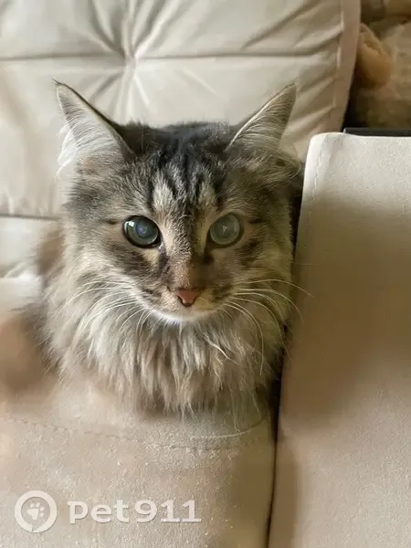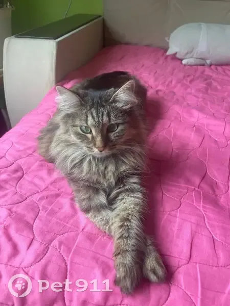 Серо-коричневый окрас, белый воротничок, черные пятнышки по бокам, полосочки на лапках и большая полоса, идущая от головы по спине. Глаза зеленые, нос кирпичного цвета. Ушла утром гулять рядом с участком и не вернулась. Очень пугливая, в состоянии шока забирается в укромное место и ни на что не реагирует.