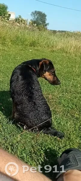 Собака породы ягдтерьер, чёрная с рыжим, девочка. Приходит на участок в Село Камышево Белоярский район Свердловская область (подкармливаю ее).