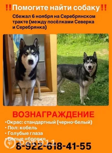 ПРОПАЛ ХАСКИ Помогите найти НАШЕДШЕМУ - ВОЗНАГРАЖДЕНИЕ 6 ноября на Серебрянском тракте (между посёлками Северка и Серебрянка) сбежал хаски по кличке Тума. ОСОБЫЕ ПРИМЕТЫ: · Окрас: стандартный черно-белый · Пол: кобель · Без ошейника · Голубые глаза, белые «брови» Очень просим всех, кто его видел или знает о местонахождении, НЕМЕДЛЕННО позвонить по номеру: 8-922-618-41-55 Любая информация важна! Пожалуйста, сделайте репост!