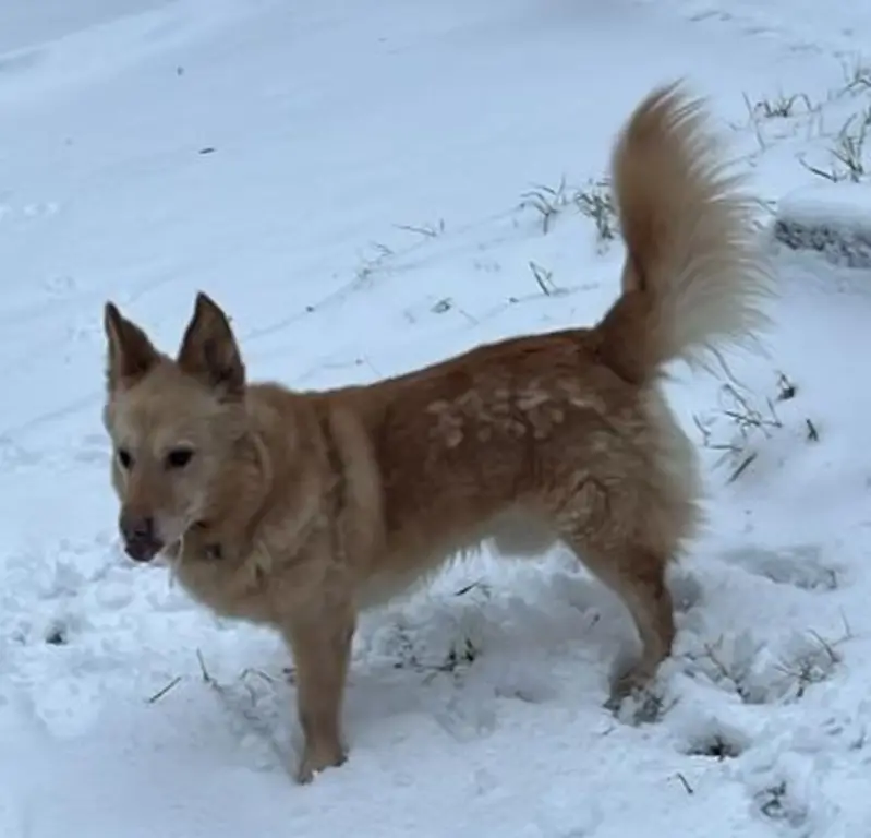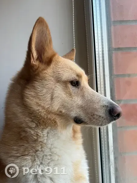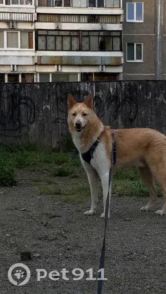 Порода Лайка, Окрас рыжий с белым, Синяя шлейка, Кличка Сани