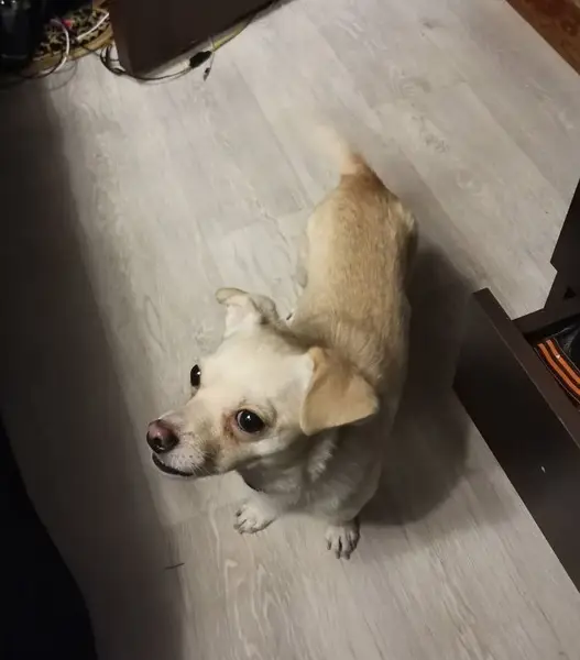 Найдена белая собака, кобель в Светлогорске, команды знает, с ошейником, контактная, скорее всего домашняя. Шерсть хорошая, зубы тоже, повреждены немного лапы. Явно домашняя.