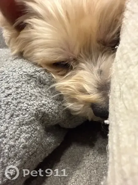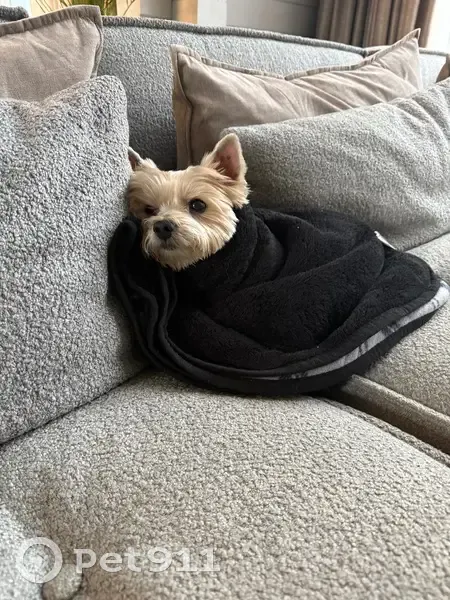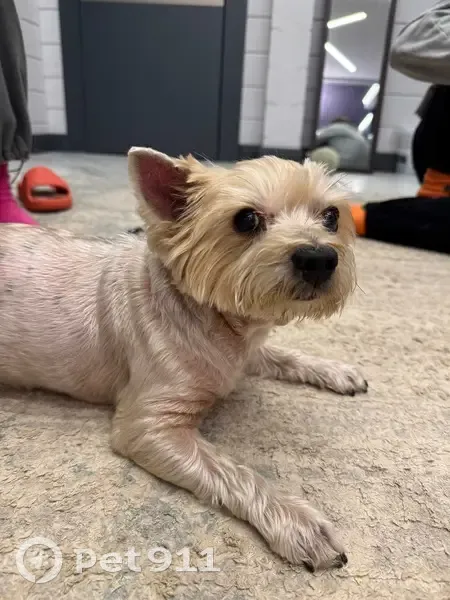 Йоркширский терьер, мальчик, кострированный, был в черной шлейке с зеленой оконтовкой.