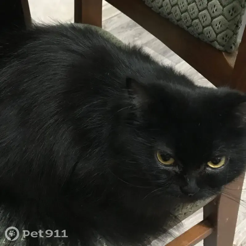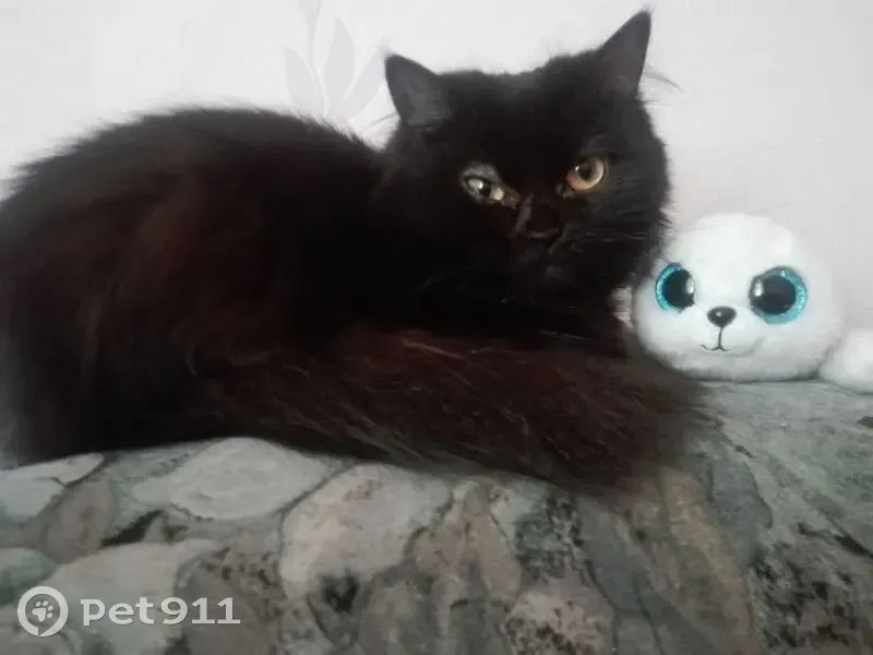 Окрас черный, немного с шоколадным оттенком, пушистая, большие жёлтые глаза. Возраст 7 лет. Зовут Маркиза. Выпрыгнула из окна. Она бывший бездомыш. Склонность к убеганию была всегда, не уследили. Кошка ласковая, любопытная, легко идет на контакт к любому. Но в стрессе может шипеть и царапаться.