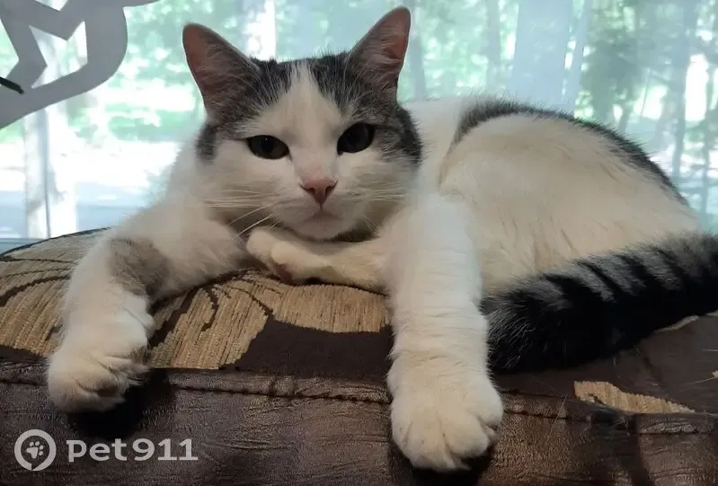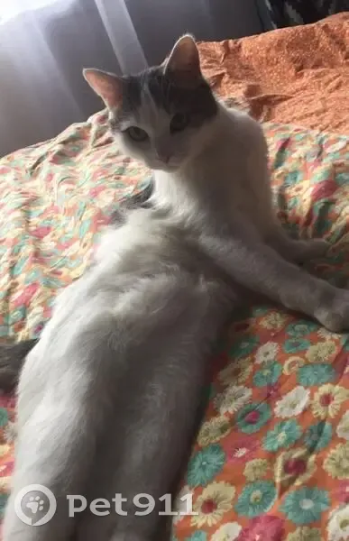 Кот домашний, не привыкший к улице. Спрыгнул с 1 этажа квартиры опрокинув москитную сетку. Окрас белый с серыми пятнами, короткошерстный, хвост серый в полоску, не крупный