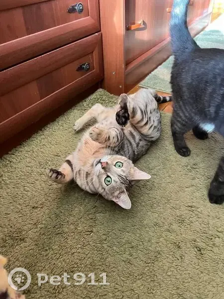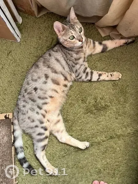 Окрас серебристый, но на животе и на мордочке лёгкий рыжий оттенок. Порода бенгал. Выделяющиеся зелёные глаза. По весу 5 кг, довольно крупный, длинное телосложение. Пугливый, любопытный характер
