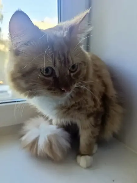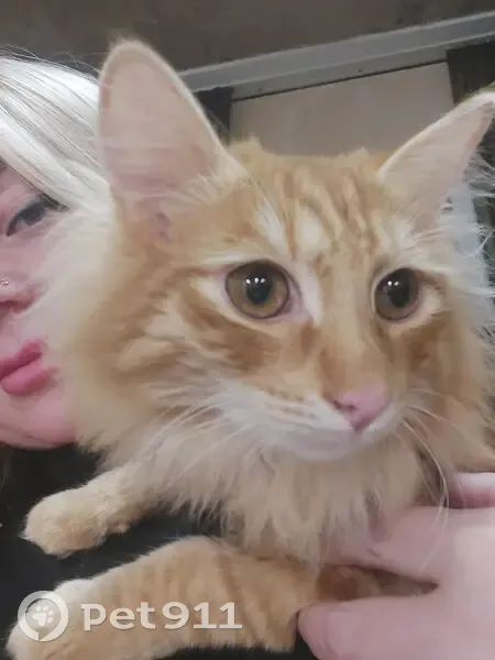Котик рыженький и пушистый. Возраст 1,5 года. На шее ошейник в виде синего платочка и + ошейник с GPS трекером, на котором с обратной стороны указано имя кота и номер телефона 89042700275