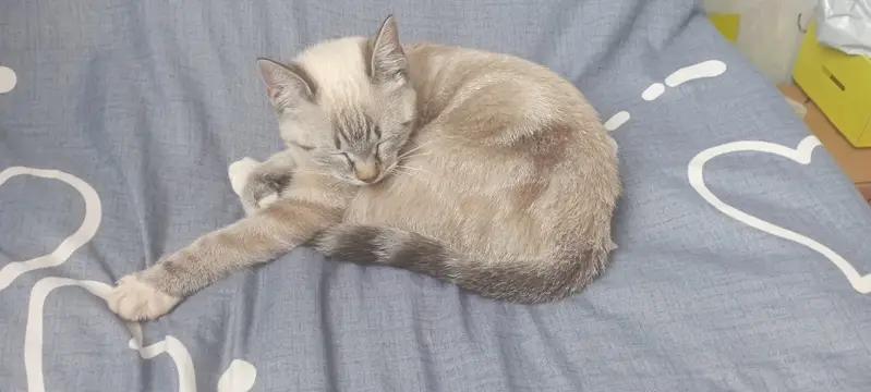 Окрас кремового цвета, мордочка,уши,хвотс,лапы пепельного цвета, глаза голубые. Шрам на правой передней лапе, со стороны отдельного когтя.Шрам на животе, после стерелизации.
