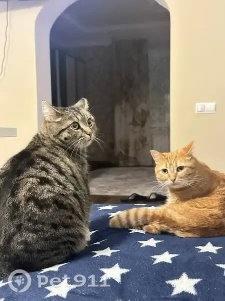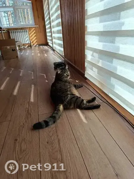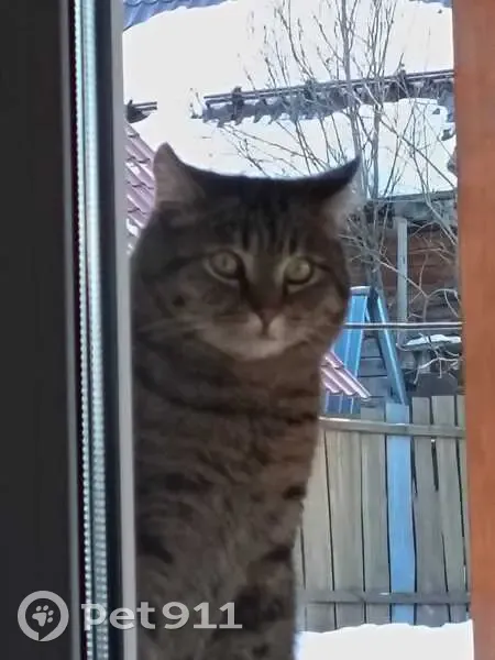 Кот в полоску, толстый, характерной особенностью является то, что взгляд у него всегда, как будто в глубь, широкие зрачки, редко мяукает, не тактильный