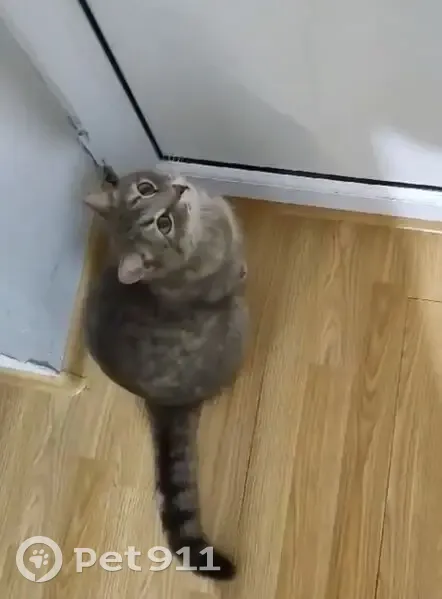 Кошка крупного размера, серая с темными пятнами и полосками. Живот светлый. Мордочка внизу белая. Стерилизована. 2 июня в 14 часов испугалась шума грузовика и сорвалась с поводка. Убежала в лесок - посадку вдоль трассы. Был очень сильный ветер, деревья шумели. Мы её искали, звали. Из-за шума и густых зарослей кустарника не смогли найти. Кошка пугливая, не ручная.