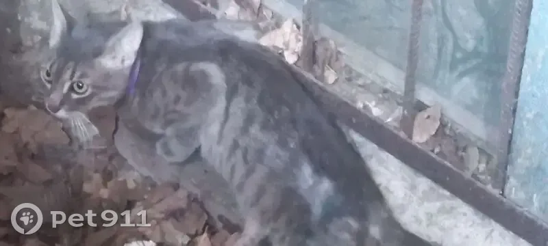 Кошка серо-голубая с крупным белесыми пятнышками в сереневом ошейники,у кошки видно послеоперационный шрам и следы зеленки на левом бедре,основной упор передвижения на переднии лапы,она сильно напугана и в стрессе ,улицы не знает.