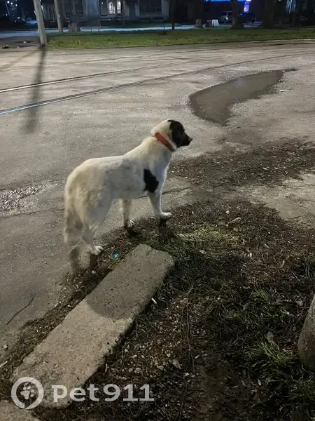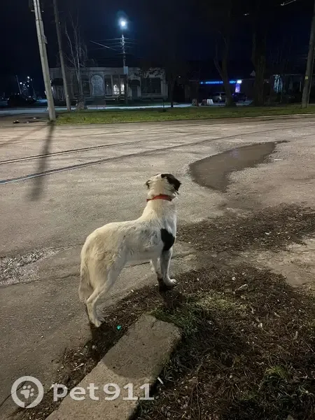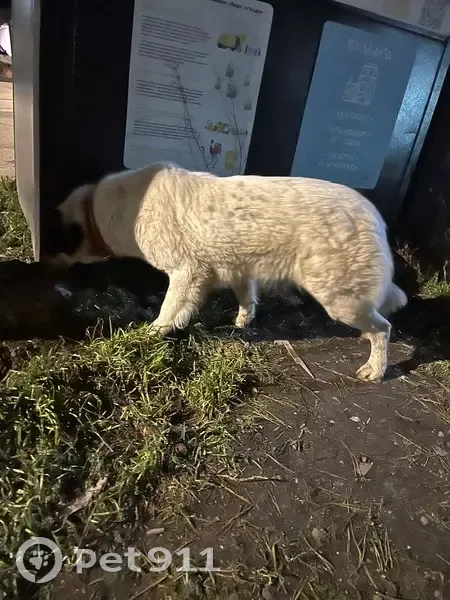 Белая собака с черными пятнами, ошейником и больным глазом. Видели возле остановки трамвая Смирновский переулок. Бродит за разными людьми. Очень дружелюбная.