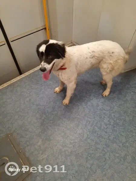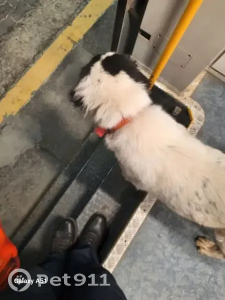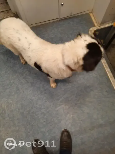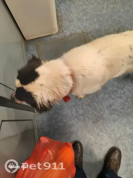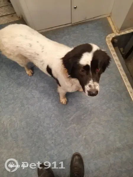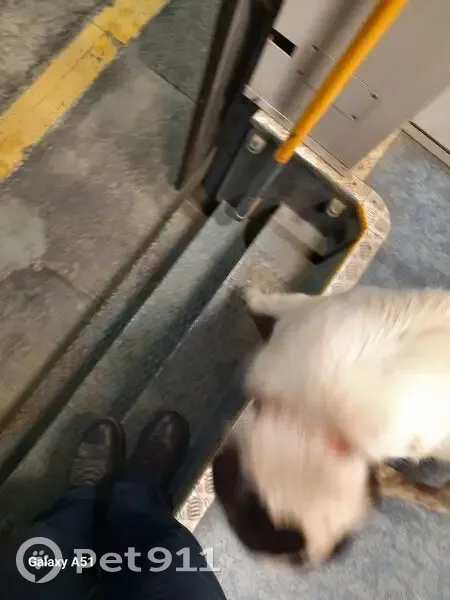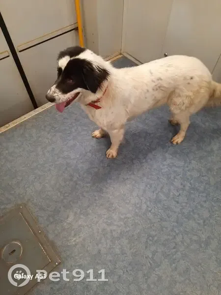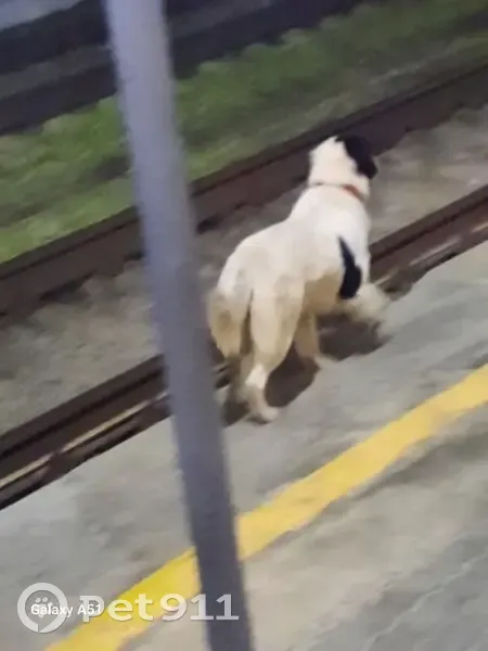 Белый с чёрными ушами красным ошейником Левый глаз поранин если смотреть прямо то правый ,Искал людей бегал по пирону Жд вокзал Пригородный Таганрог, Старый вокзал сел в электричку на Успенку Был выражен на станции Марцево пригород Таганрога работниками жд поезда .Сейчас должен находится на станции Марцево город Таганрог или в её окрестностях, необходимо спросить у работников станции