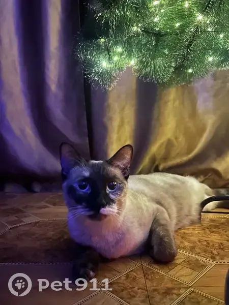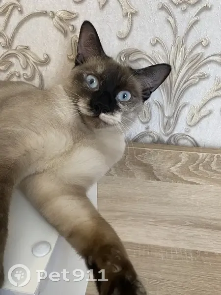 Сиамская кошка, белая с темными пятнами. На ножке один пальчик белый, голубые глаза. Приехали домой и её не обнаружили, может выбежала в подъезд или же спрыгнула с окна