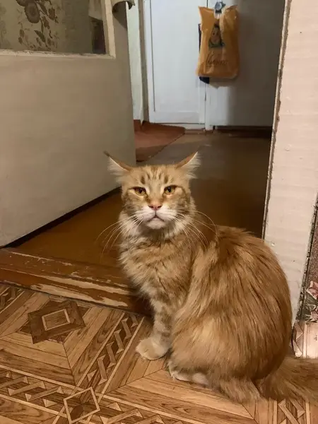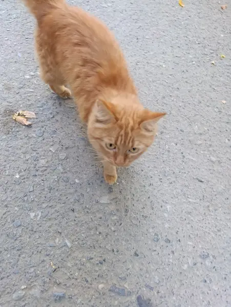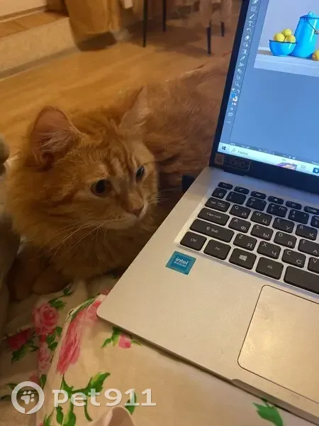 Рыжий, не сильно пушистый, хвост кисточкой (не до конца отрос, летом брили налысо) Пугливый, крикливый, может полезть драться (чаще всего просто защищается) На кличку отзывается