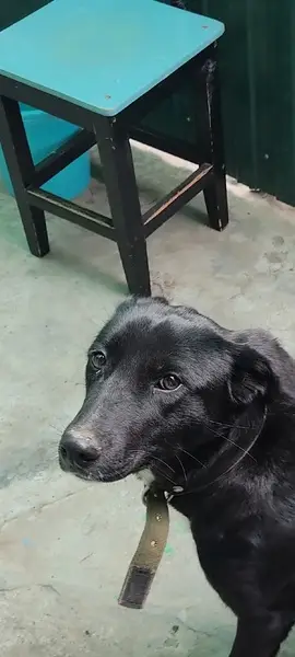 Черная, полосатый с красным ошейник, большая, дружелюбная, активная. Может приставать к людям, не агрессивная. Убежала ночью.
