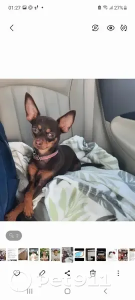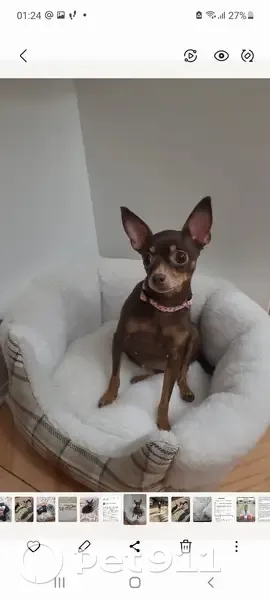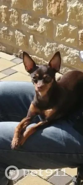 Русский той терьер. Окрас коричневый . Есть клеймо. Кличка Ляся . Очень ласковая