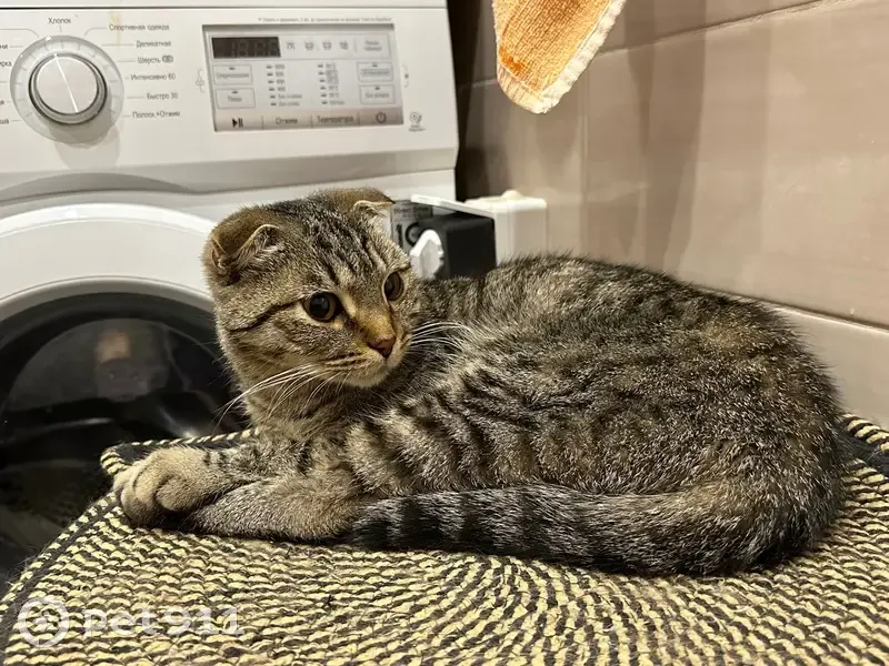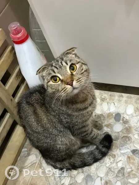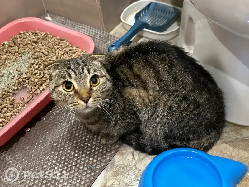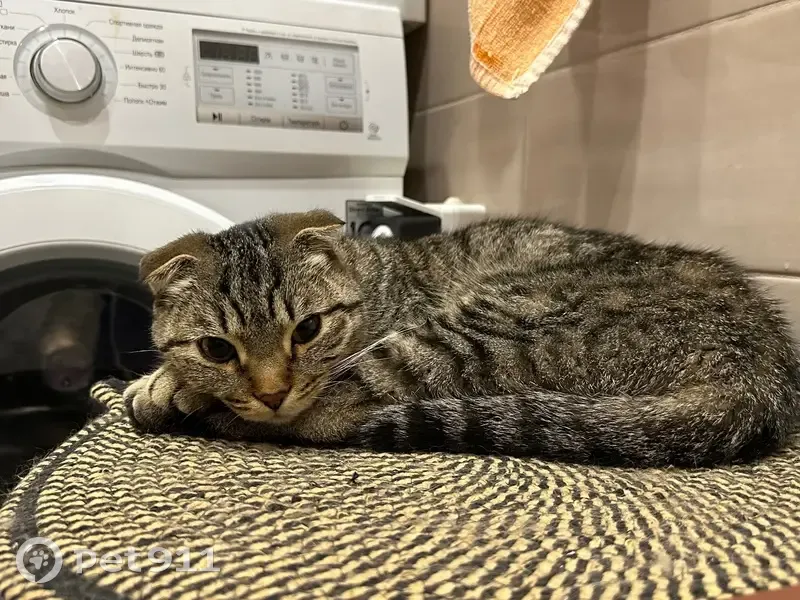 Найдена кошка в районе улицы Чичерина 23 про окнами, по всей видимости шотландская вислоухая окраса табби. Ласковая, ухоженного вида, без наличия блох, но очень худая и истощенная, сломан клык, по весу всего 2,3 килограмма.