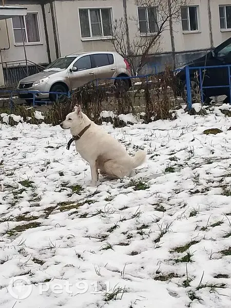 Белая собака с чёрными пятнышками на ушах. Глаза разные - левый голубой, правый чёрный. Пес (скорее всего мальчик) не агрессивный, подходит к людям, но неуверенно. На шее зелёный ошейник. Забрать не смогла, потому что дома два кота. Он бегает вокруг жилого дома