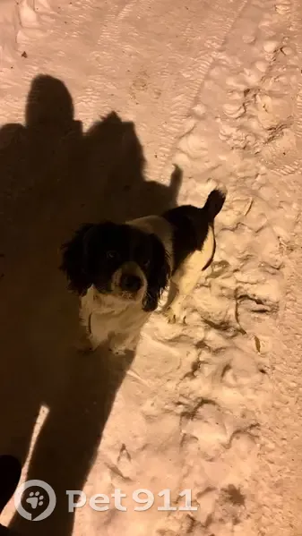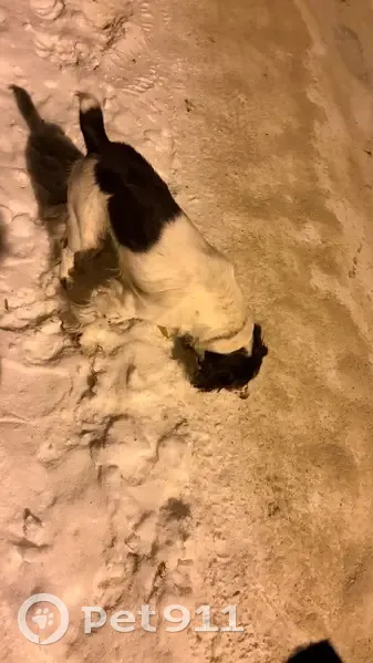 Окрас бело-коричневый, с ошейником. Очень добрый взгляд. Говорят бегает сегодня весь день, подходит ко всем людям и собакам. На улице холодно, видно что собака домашняя, очень жалко пёселя в такой мороз