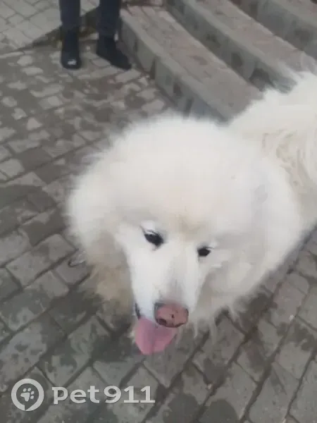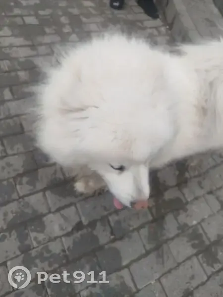 Собака белого цвета ,пушистая , пол не знаю , с ошейником, встретилась на улице Рылеева на против магазина Европа и потом около школы 36.