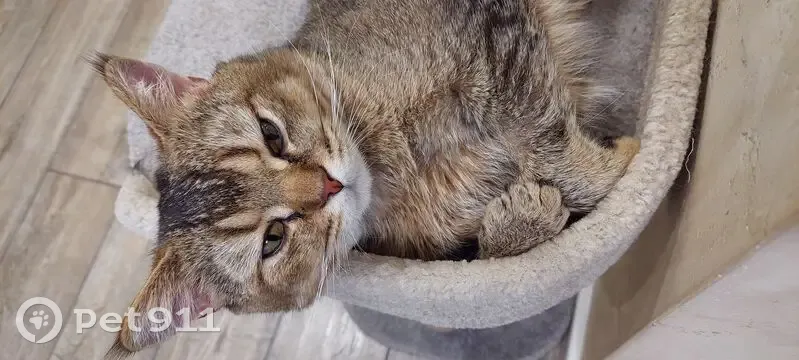 Окрас тикированный рыжий с чёрным. На подбородке и шее шерсть светло-бежевая, на груди - рыжая. На лапах и хвосте чёрные полоски. На ушах кисточки. При дневном свете сверху выглядит как серый. Левый глаз может гноиться (сбежал недолеченный).