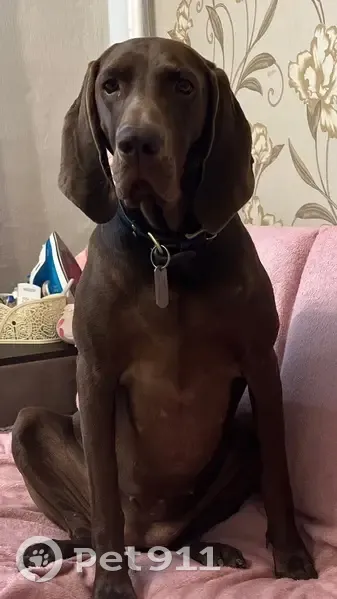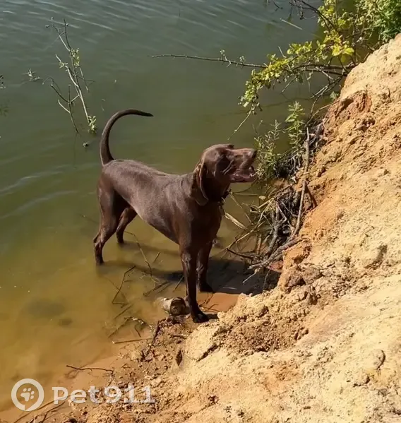 Коричневый шоколадный окрас равномерный без пятен. Гладкошерстная, блестит переливами, американский кунхаунд, девочка три года, домашняя ( на улице не живет) охотничья порода. Видели на Полынковском кладбище в 10 утра.