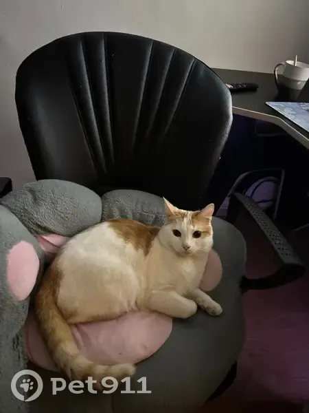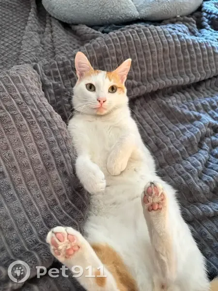 Белый котик с рыжими пятнышками вдоль спины, носит ошейник с цветочками. Кот не ручной, к чужим не идет. Раньше приходил утром/к обеду домой, впервые ушел и не возвращается несколько дней.