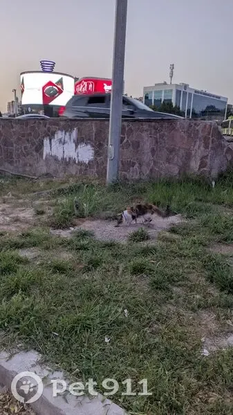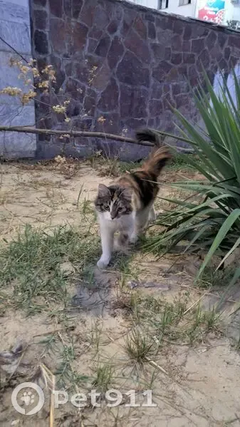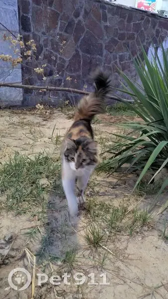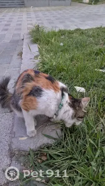 Трёхцветная кошка, пушистая, с зелёным ошейником с белыми лапками. Людей не боится, ласковая. Была по середине дороги. Оставила около центральной кассы узбекских авиалиний. К сожалению, забрать не смогла, очень сильная аллергия