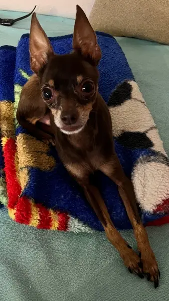 Той-терьер мини, девочка, по кличке Корица. Окрас бежево-коричневый, характер - очень пугливый, но дружелюбный. Из особых примет: частично висит левое ухо, и немного неправильно поставлена правая передняя лапа (ранее была операция). Убежала во время начала ракетой опасности, испугавшись громких звуков.
