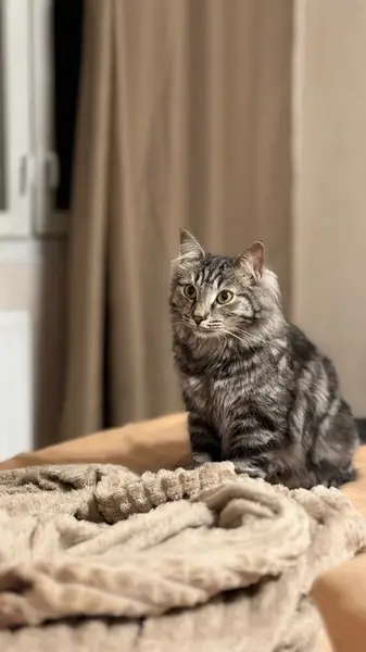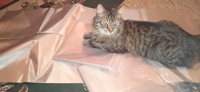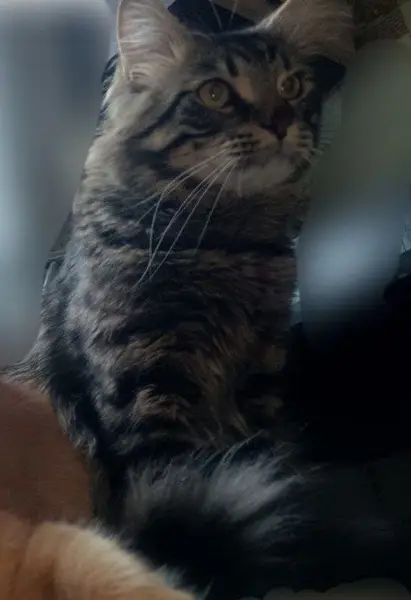 Коричневый с чёрными полосками и пятнами, пушистый, ласковый, добрый. Длиннолапый, длинохвостый, 7-10 месяцев. Похож на смесь с мейн-куном. К лотку приучен.