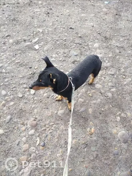 Молодой пёс, небольшого размера, окрас чёрный с рыжими подпалинами (напоминает помесь добермана/цвергпинчера или таксы), уши стоят, хвост купирован. Был найден возле ТЦ