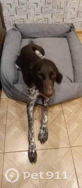 Собака породы курцхаар. Окрас коричневый с белыми пятнами и коричневым крапом. Ошейник кожаный коричневый. Отличительная черта у собаки травмирована лапа, проведена операция, вставлена пластина.