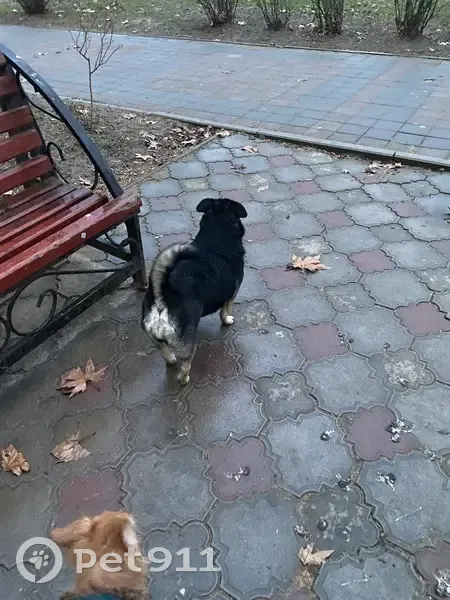 Черный окрас,с белыми короткими лапка,толстенькая девочка,ласковая,пищала и моячелась,похожа на домашнюю,без поводка. Начала играться с моей собакой