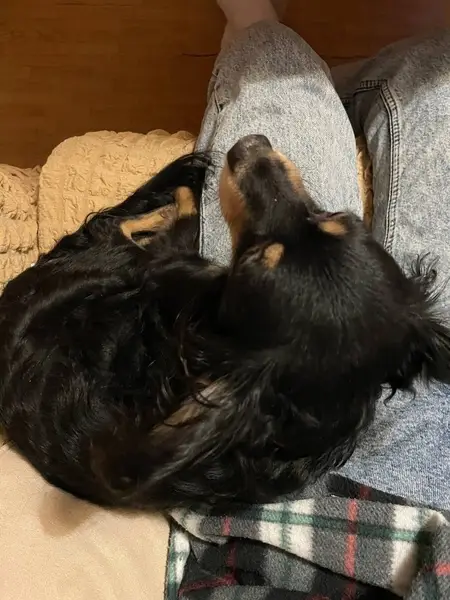 Найден пес черного окраса с рыжими подпалинами (на грудке тонкая белая полоска) в г.Тихвин ( район ПМК-20). Чуть не попал под машину. Скорей всего он породистый - Английский коккер-спаниель.