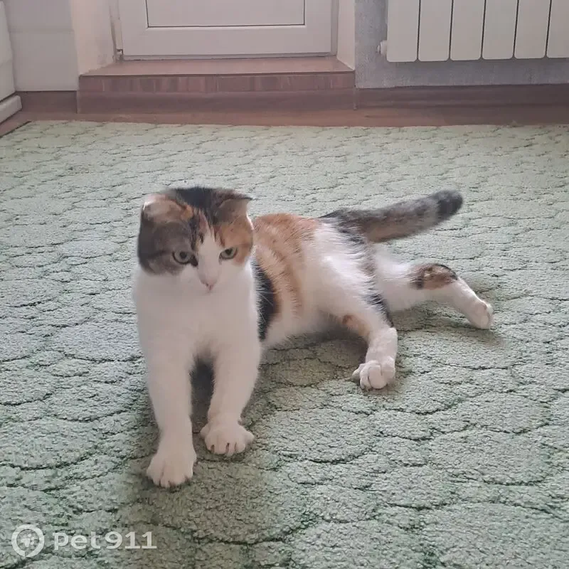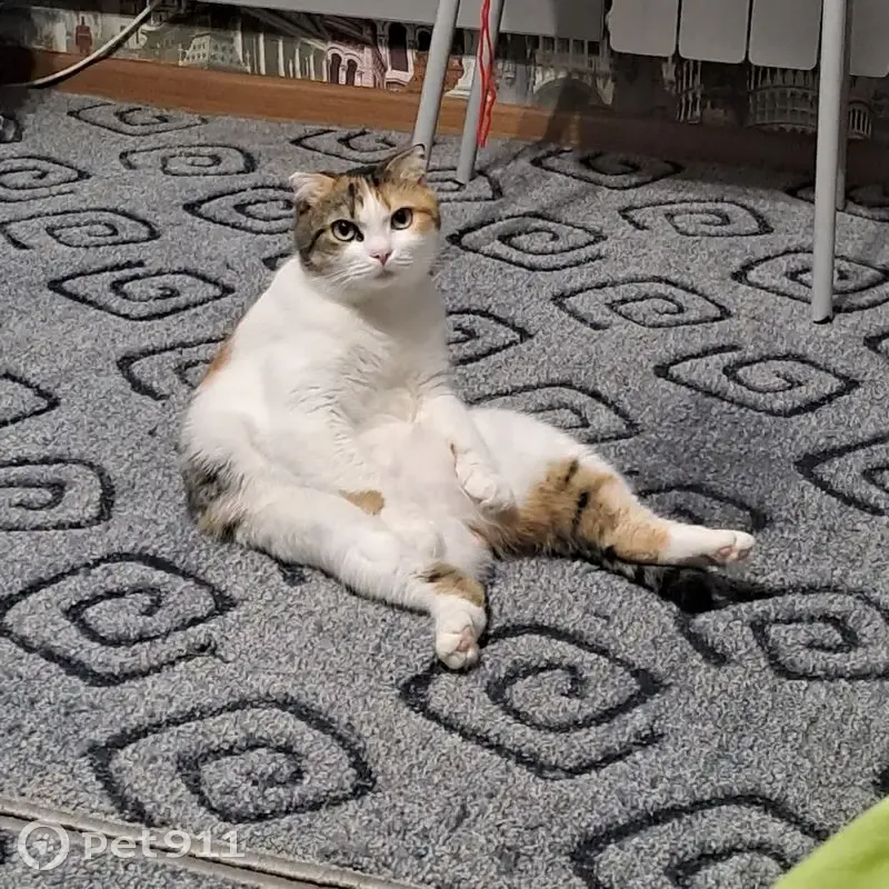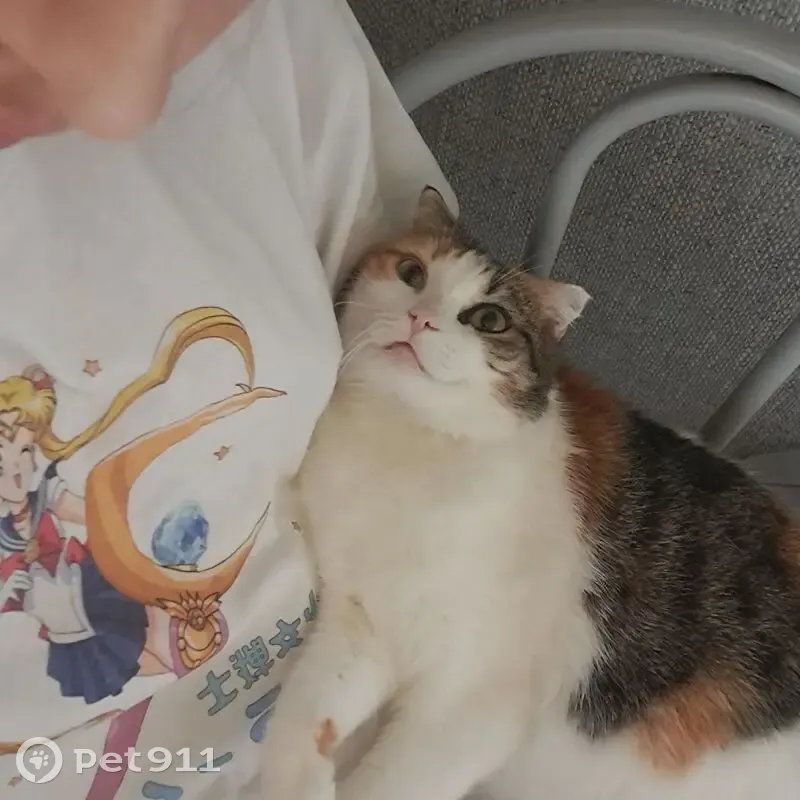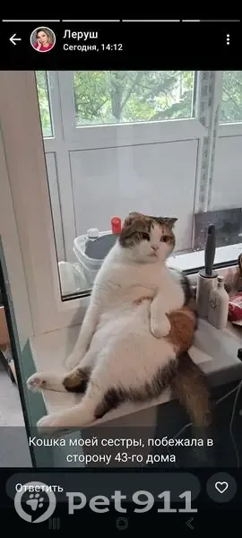 Миса трехцветная, непородистая, крупная кошечка(бело-черно-рыжая). Она домашняя и очень пугливая, первый раз на улице. Вырвалась из шлейки и убежала 31 июля.