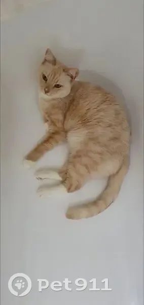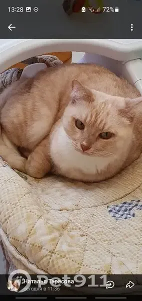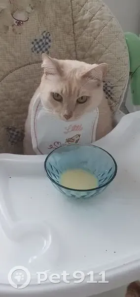 Окрас песочно-розоватый. На носу маленькое белое пятнышко. Сам кожаный нос неоднородный по окарасу с более тёмным участком. На передних лапках белые носочки, на задних белые гольфики. Шерсть не длинная и очень мягкая, как у британцев. Любит залазить в маленькие коробки.