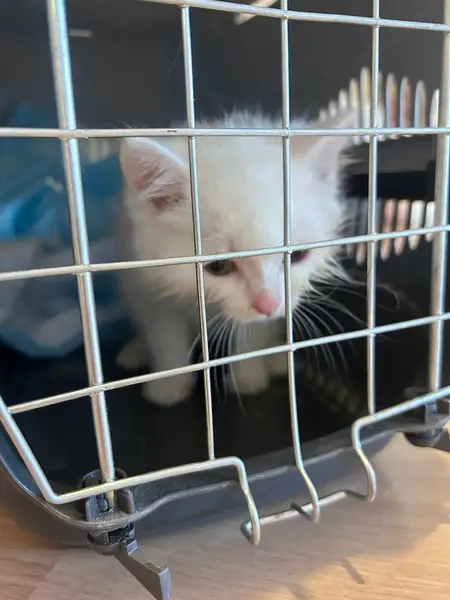 Маленький котенок примерно 3-х месяцев, на верхней части головы 3 черных пятнышка, носик розовый, подушечки лапок розовые, глаза коричнево-желто-зеленого цвета, ушки длинные.