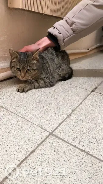 Котик полосатый, домашний, упитанный, сильно напуган. Потерялся или выбросили. Дня два сидит во дворе. Занёс в подъезд, дал воды и еды. Забрать не могу. У самого кот и кошка