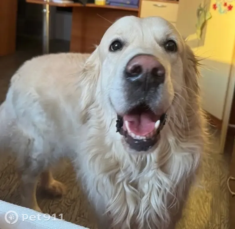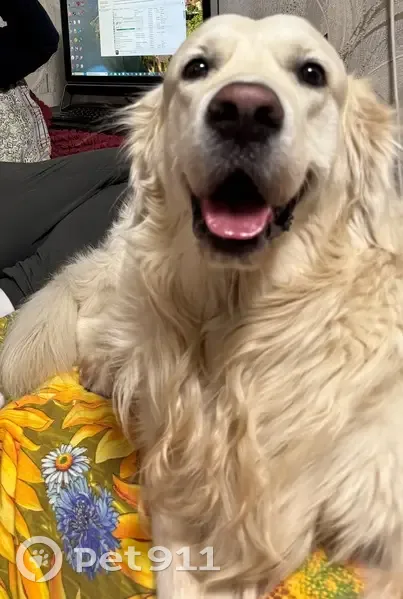 Порода-золотистый ретривер, кобель, 4 года Большого размера, весит примерно 45кг, белого цвета, грудь и спина кудрявая, на спине шерсть кремового оттенка. Ошейник отсутствует, откликается на кличку Юджин Просьба-если вы увидели, не пытайтесь его поймать, пришлите фото или позвонить по телефону